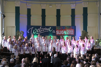 We travelled to Sligo Choral Festival last weekend, on Wharton's comfiest coach, and had a lovely meal together in the Glasshouse Hotel. On the morning of our competition, we had a short sharp rehearsal with Eileen, sorted our scarves and ties, before setting out to the Gillooly Hall. Our competition had 11 choirs, so it was a long but fabulous morning, each choir in turn singing for the others, for the audience, and for the adjudicators who gave us high praise for our 900 miles and Adiemus. Our section was won by Lumina from WIT (who were our, and the audience's, favourite by far).